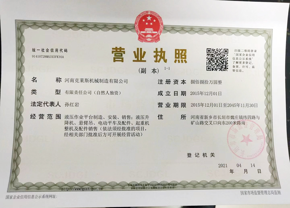 河南克萊斯機(jī)械制造有限公司位于河南省長(zhǎng)垣市魏莊工業(yè)園區(qū),公司注冊(cè)資金捌佰捌拾萬元整,在職員工40余名,擁有研發(fā)設(shè)計(jì)團(tuán)隊(duì),是一家生產(chǎn)液壓升降作業(yè)平臺(tái)及旋臂起重機(jī)生產(chǎn)銷售的廠家。  公司主要產(chǎn)品有:固定導(dǎo)軌式液壓升降作業(yè)平臺(tái)、移動(dòng)式液壓升降平臺(tái)、車載式液壓升降平臺(tái);定柱式懸臂吊、墻壁吊、電動(dòng)平車、登車橋等。  精良的設(shè)備,嚴(yán)格的管理是公司得以不斷發(fā)展壯大、產(chǎn)品能夠贏得用戶依賴的根本所在。  “精確、...... <了解更多>